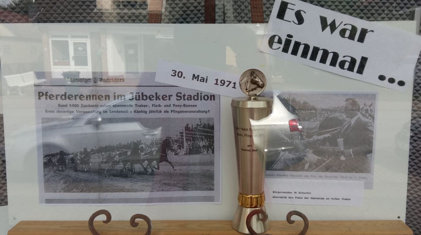 Die Jübeker staunen nicht schlecht, wenn sie einen Blick in das Schaufenster der alten Apotheke werfen: Erinnerungen an die Jübeker Trabrenn-Veranstaltungen aus dem Jahre 1971 fallen sofort ins Auge. Nicht nur „alte“ Bilder und Ehrenpreise dienen als Dekoration, sondern auch Bilder unserer aktuellen Trabreit-Championess Ronja Walter und des „Goldhelms“ Michael Nimczyk.